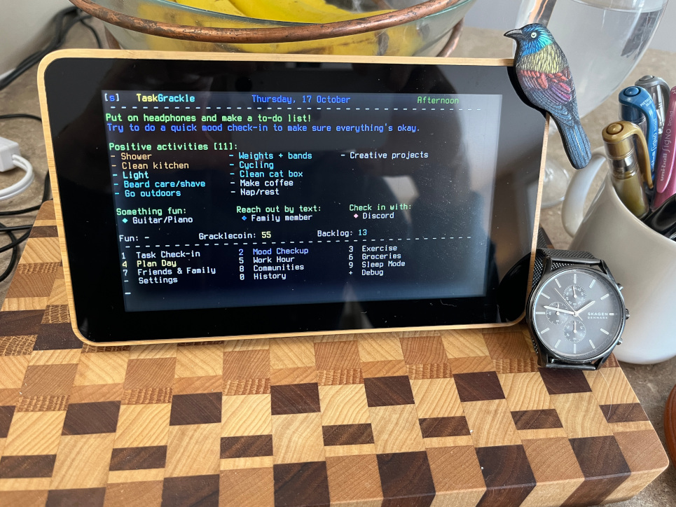 New release! TaskGrackle is an annoying bird that helps manage your life. Run as a standalone computer or from a Terminal window on macOS or Windows.